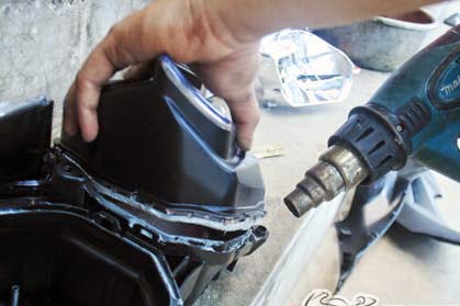 2. Pertama-tama lepas dulu headlamp motor. Jika sudah menggunakan heat gun, lepas mika dari dudukanya dengan sedikit dicungkil menggunakan obeng (-).