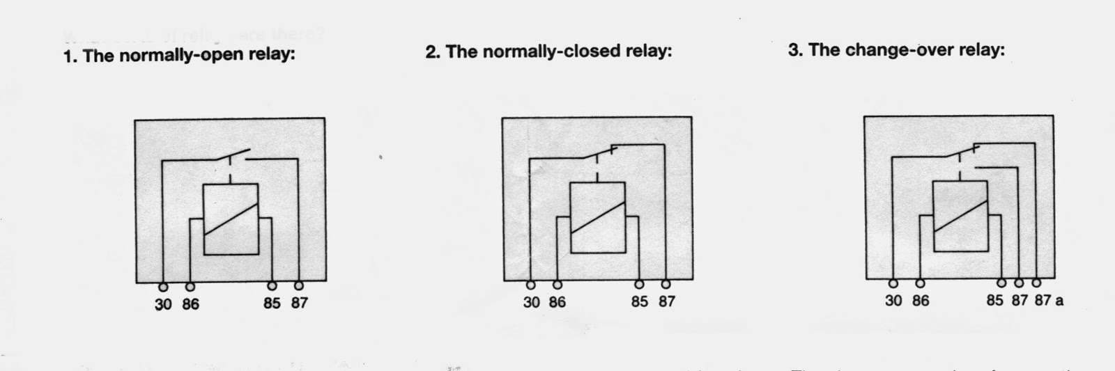 Selain relay 4 kaki atau 4 terminal ada juga relay 5 kaki, 6 kaki dll. Prinsip kerjanya tetap sama, perbedaanya hanya kontak poinnya saja yang diperbanyak. Pada relay 5 kaki, disana terdapat terminal 87 dan 87 a. Biasanya terminal 87a ini kebalikan dari terminal 87 artinya ketika terminal 87 terhubung dengan terminal 30, maka terminal 87a terputus dengan terminal 30 begitu juga sebaliknya. Relay dibedakan menjadi 2 yakni normaly open dan normaly close. Yang dimaksud dengan normaly open adalah saat normal atau tidak ada arus listrik yang mengalir ke terminal 85 dan 86 maka terminal 87 dan 30 tidak terhubung. Sedangkan normaly close adalah sebaliknya ketika dalam keadaan normal yakni terminal 85 dan 86 atau yang menuju kumparan tidak dialiri arus listrik maka terminal 30 dan 87 terhubung.