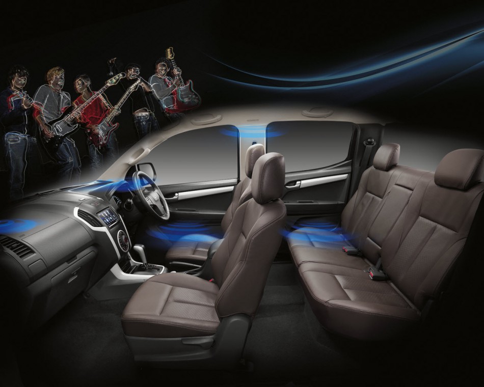 Fitur Isuzu D-Max antara lain: 6 speaker, sistem kemudi berlapis kulit dengan panel audio, Velg 17 inch, Ac otomatis, sensor parkir, alarm, dan detail eksterior berlapis krom.
