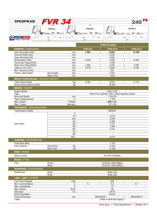 FVR 34 L E2    (4X2)  6  RODA,  240 PS – 12 TON, WB 4250 : Rp.  462.000.000